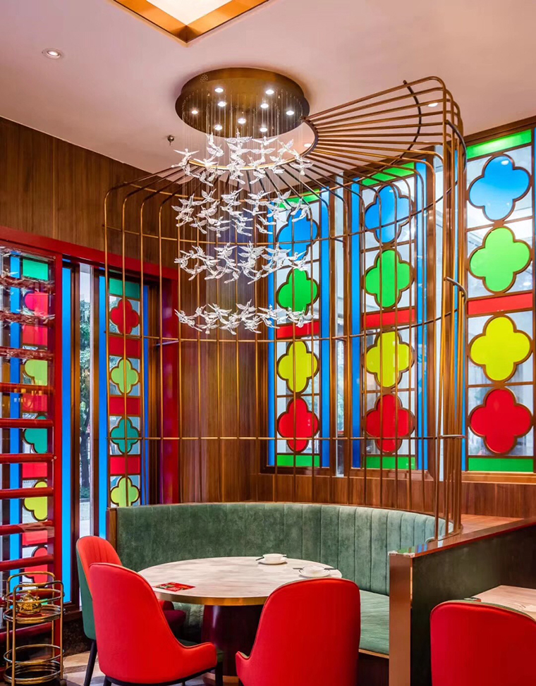 餐廳的空間裝飾設(shè)計是由門頭形象、地面、墻面、天花頂飾、家具設(shè)備、燈飾照明、綠色植物、軟裝飾等多種因素和諧融合而成,顧客在空間中的活動,是一種連續(xù)而有趣的運動。在我們進行設(shè)計的時候要考慮到空間與人的呼應(yīng),既要相互獨立和相互聯(lián)系的各種功能空間,又要有便捷和流暢的動線路徑,同時在空間中使用具有典型西關(guān)茶樓文化特征的裝飾品如鳥籠式吊燈、定制的茶幾、量身定制的茶具進行點綴,豐富了空間的感受,烘托了茶樓的氣氛。而通過對聯(lián)、匾額、字畫的懸掛,則創(chuàng)造了一種含蓄優(yōu)雅的境界。