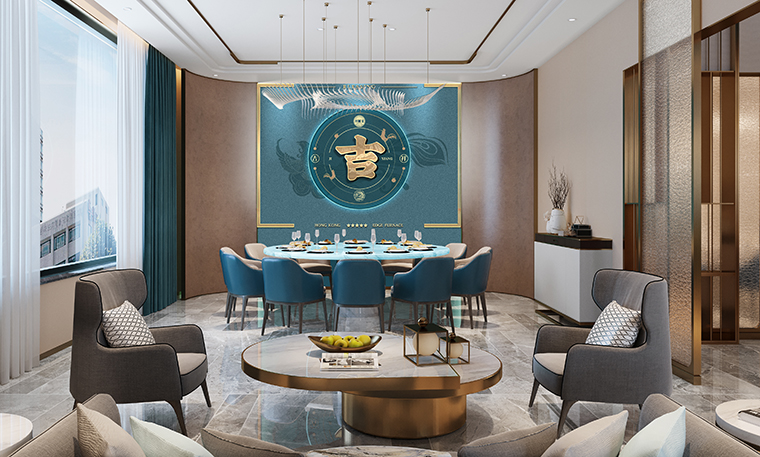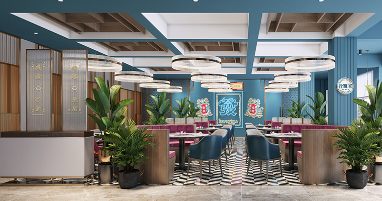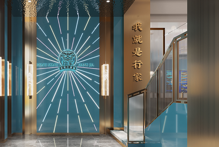 行家花膠雞港式打邊爐餐廳在顏色設(shè)計(jì)上結(jié)合品牌色,大面積使用不銹鋼金色,藍(lán)綠色,暗紅色,將餐廳打造成主題風(fēng)格截然不同的港式餐廳,同時(shí)融入具有地域風(fēng)情的港式風(fēng)味,在文化元素上植入恭喜發(fā)財(cái),順、發(fā)、喜等傳統(tǒng)香港吉祥話語(yǔ)元素,傳統(tǒng)與現(xiàn)代的元素融合在餐飲空間中,突破了人們對(duì)傳統(tǒng)港式餐廳的認(rèn)知,重新定義新派港式打邊爐餐廳的基調(diào)。