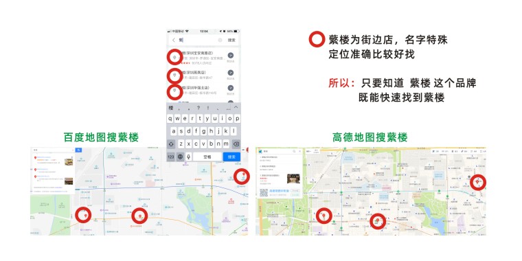 蘩樓”這個詞在搜索端屬于新詞,且由于都是臨街店鋪,只要在導航地圖上搜索“蘩樓”即可出現店面的準確地址,因此在海報地址信息中只需要告訴顧客店址區域即可,如:“華強北店”顧客自動腦補深圳華強北區域蘩樓,加上智能手機強大的導航功能,只需要搜索“蘩樓”選取“華強北”為主的關鍵詞即可知道離店的大概距離。