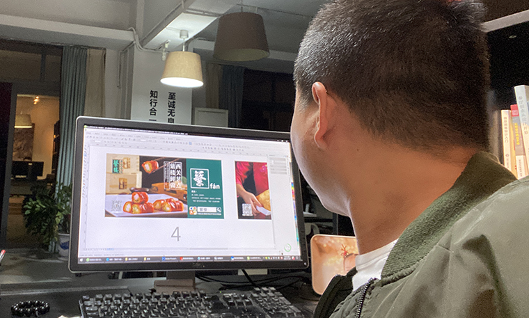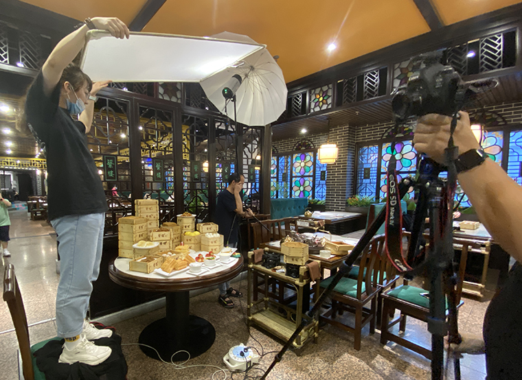 為達到理想拍攝效果,品深設計師再次來到蘩樓與廚師交流,了解這十款產品的特色,用料,制作工藝等細節,同時也購買有關廣式點心制作相關書籍進行對比學習,獲得很多新發現,如:判斷手工炸油條好壞,必須要展示其“
