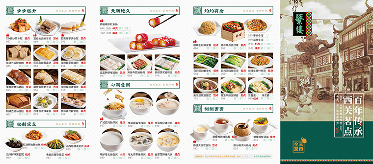 菜單價格避免使用常規(guī)排版版式,盡量弱化代替,將價格數(shù)字縮小,金錢標(biāo)志¥20簡化為20.價格后面標(biāo)明菜品的單位。價格代替,例如品深設(shè)計做的悅得閑、寶粵樓、蘩樓等廣式點(diǎn)心的菜單,都不放價格,用小點(diǎn)、大點(diǎn)、中點(diǎn)、特點(diǎn)、頂點(diǎn)、超點(diǎn)、精點(diǎn)、佳點(diǎn)、優(yōu)點(diǎn)來代替。在底部統(tǒng)一將小點(diǎn)、大點(diǎn)、中點(diǎn)、特點(diǎn)、頂點(diǎn)、超點(diǎn)、精點(diǎn)、佳點(diǎn)、優(yōu)點(diǎn)標(biāo)上價格。菜品與價格隔離就會減少價格對顧客的影響,不經(jīng)意間放大了顧客的消費(fèi)金額。