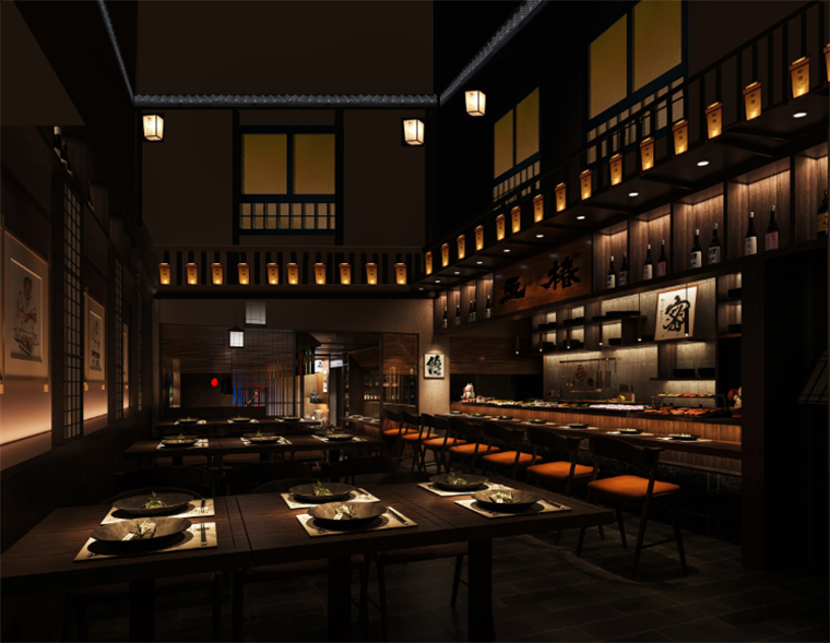 日本料理燒鳥居酒屋餐廳平面布局設計,日本料理空間裝飾效果圖設計,燒鳥居酒屋空間施工圖設計,居酒屋空間軟裝陳列設計,品牌文化植入空間策劃設計