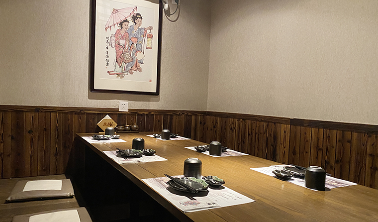 1樓是熱鬧區,二樓則是私密區,安靜區,6個包間,其中3個包間設置為榻榻米結構,滿足一部分顧客對日本料理飲食文化的追求,另外3個包間則使用了中式座椅,畢竟我們服務的絕大部分客人是中國人,還是要以中國人的使用習慣為主。2樓的2個大包間中間使用折疊門,可大可小,可以滿足了周邊客人中一些商務宴請,企業團建,小型會議的用餐需求,包間消費也容易把營業流水做起來。