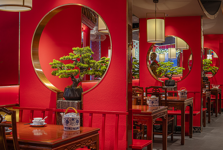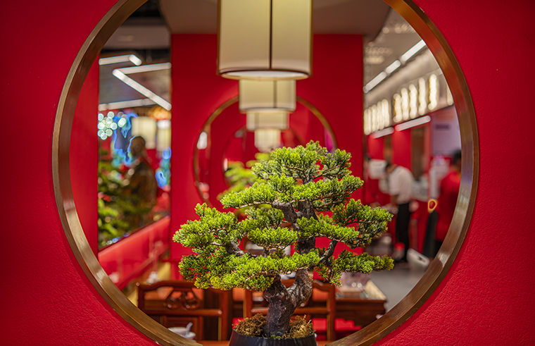 門口的迎賓人,提籠遛鳥人,跑堂人等雕塑銅人將老北京烤鴨飲食文化自然帶出;空間大量借鑒中式園林造景手法,點(diǎn)綴綠植,水景,框景,步移景異;