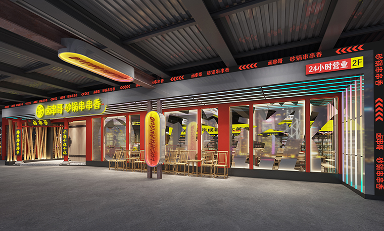 1、鹵串哥砂鍋串串香首次進入深圳市場,如何通過空間裝飾裝修設計的用餐體驗環境來表現串串香火鍋與其他火鍋、其他餐飲品類不同的市井氣,煙火氣?
