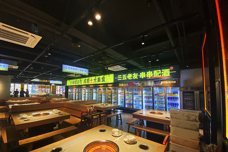 串串香火鍋的用餐特點比較獨特,類似自助火鍋。顧客自己到冰柜取串串,拿飲品,喜歡什么就拿什么。因此,在門店功能設計方面,取串串的冰柜是客流最密集的地方,需要給顧客展示出串串品類特別多的優勢。