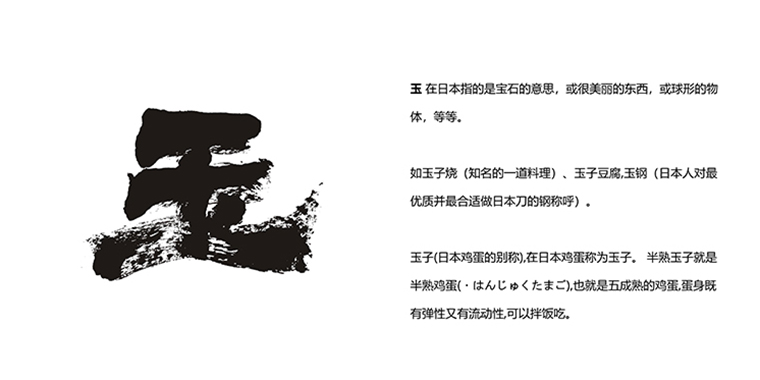 玉”在日本指的是寶石的意思,或很美麗的東西,或球形的物體等等。如玉子(日本雞蛋的別稱),半熟玉子就是半熟雞蛋(はんじゅくたまご),也就是五成熟的雞蛋,蛋身既有彈性又有流動性,可以拌飯吃。玉子燒(知名的一道料理),玉子豆腐,玉鋼(日本人對最優質并最合適做日本刀的鋼的美稱)。