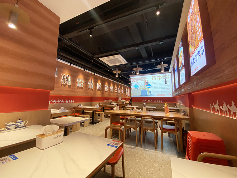 1、整個空間圍繞饸饹面是西北的小吃,在墻面的裝飾材料上用了能代表西北地貌特色的黃土高原涂料,顏色暖黃極像黃土。進入門店,仿佛置身于大西北的某個面館,讓顧客產生了品牌的認同。