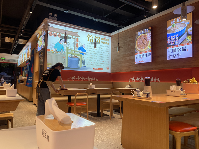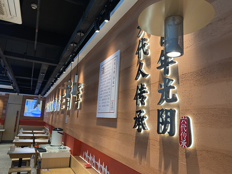 4、品深設計認為,面館本質上與簡餐是一樣的,顧客就是在簡餐和面館之間切換口味而已,所以我們在門店內部沒有過多展示品牌的文化。更多是推廣品牌、推廣產品,圖文并茂直接講清楚,饸饹面是一種什么面食?錢三順是怎么來的?錢三順的核心賣點是什么?我們主推哪些產品等等。